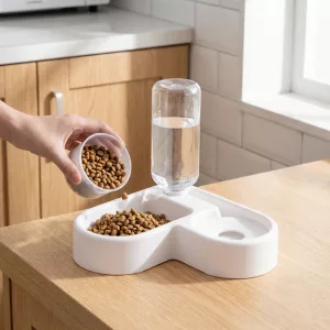 A parte da garrafa de água é uma ótima ideia. Eu encho de manhã e só preciso me preocupar à noite. As tigelas são super fáceis de lavar.