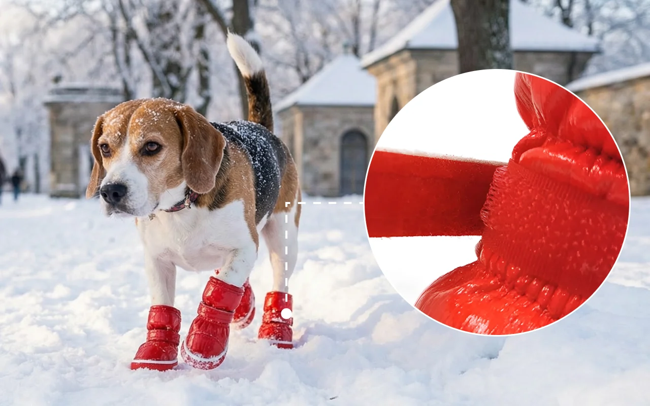 Os passeios continuam divertidos mesmo na chuva ou neve. Os sapatos Primdog bloqueiam a água e protegem as patas em ruas lamacentas.