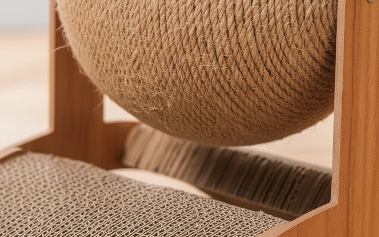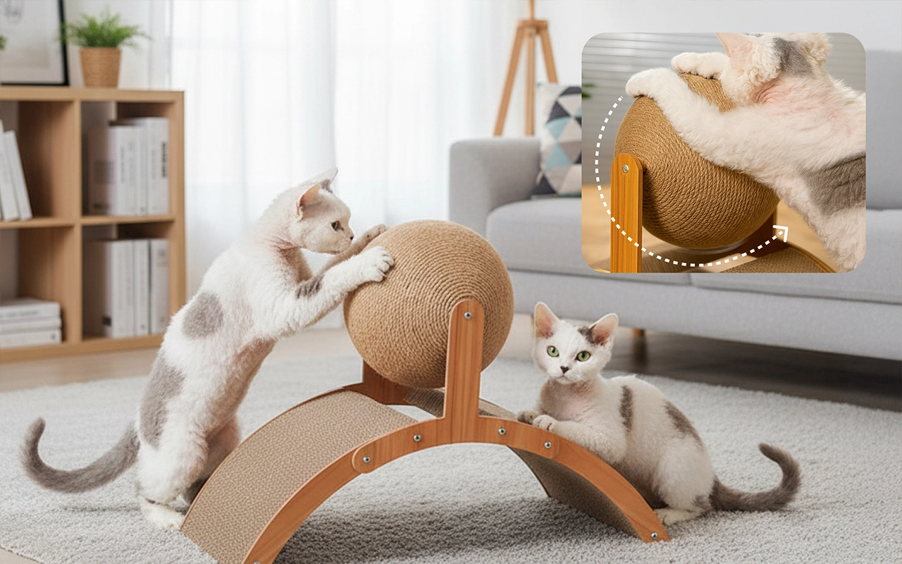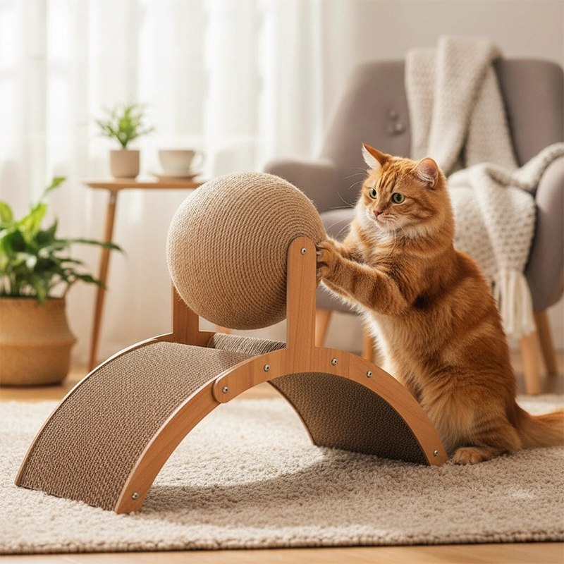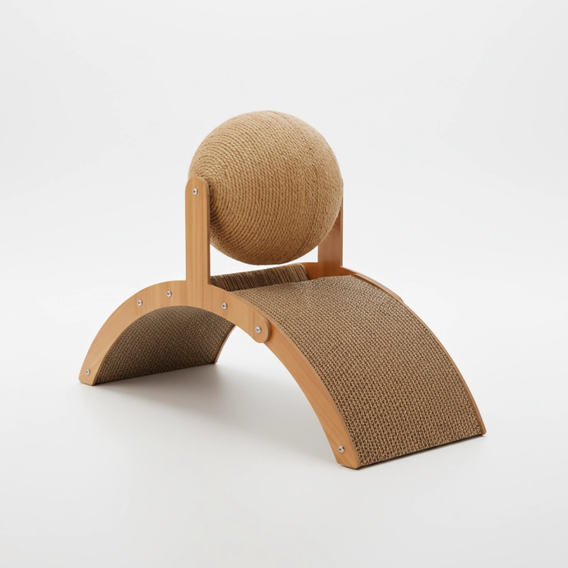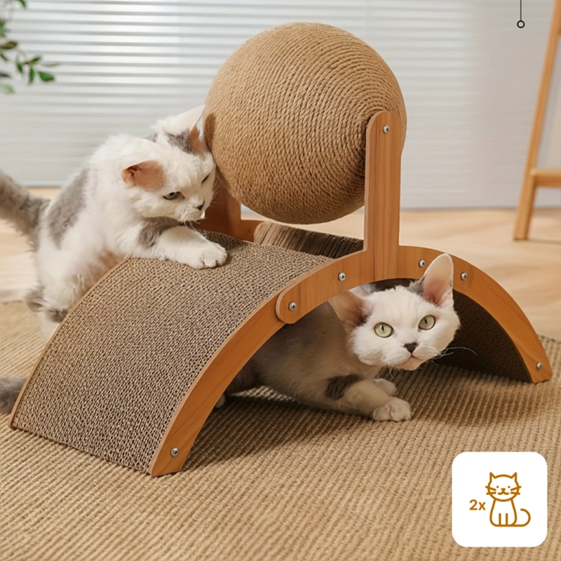 A ponte curva e a bola giratória proporcionam diversão sem fim. Gatos exploram, arranham e relaxam a cada uso.