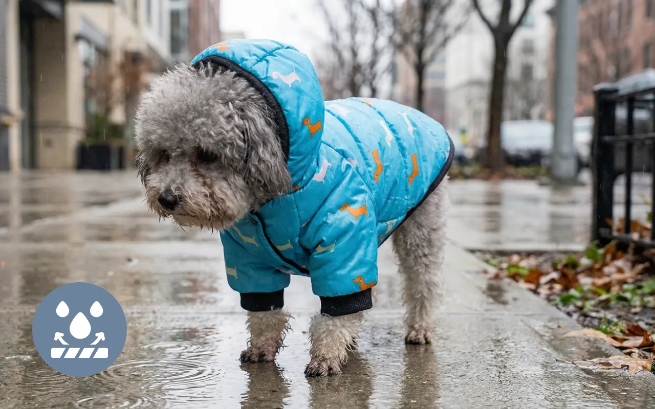 Camadas impermeáveis mantêm o pelo seco durante chuvas repentinas. Nada de pelagem úmida ou suja após passeios no parque molhado.