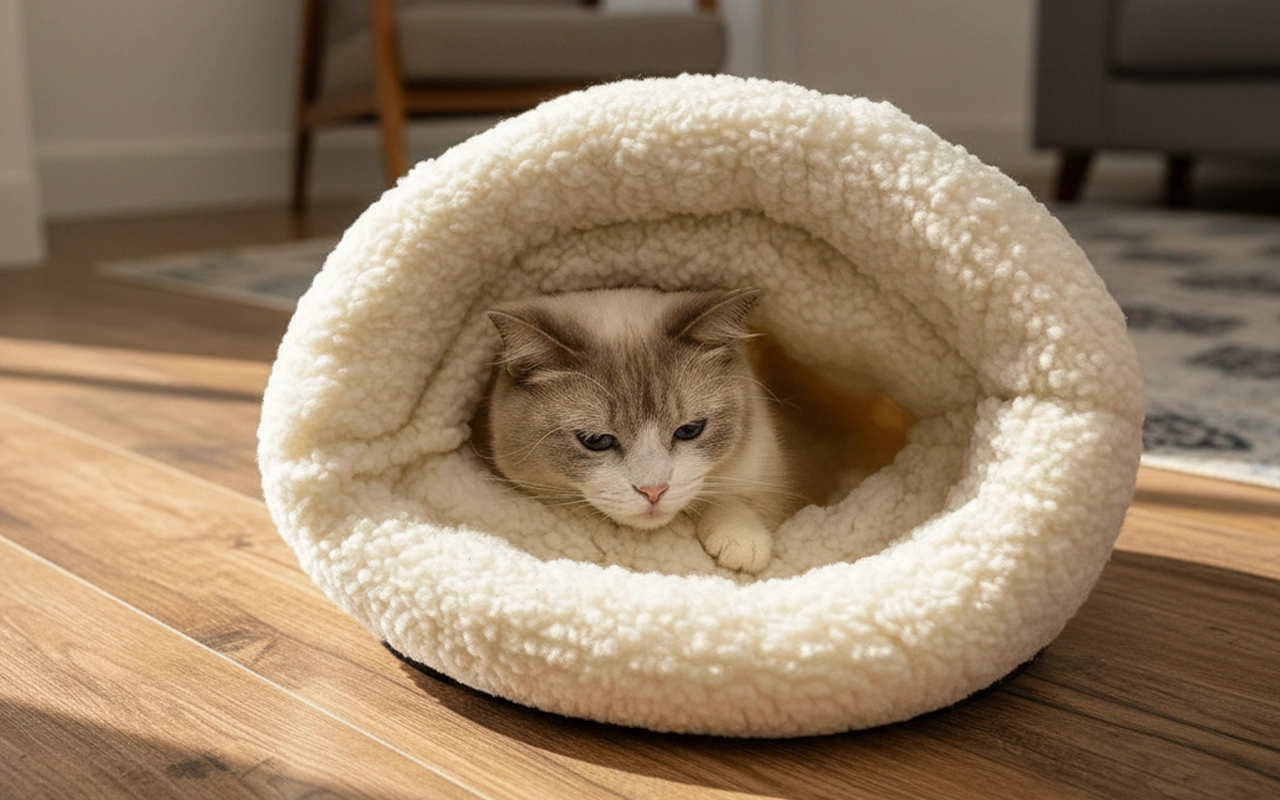 Minha gata tímida adora se enrolar dentro da caminha aconchegante todas as noites. Ela fica quentinha e parece mais relaxada e feliz do que antes.