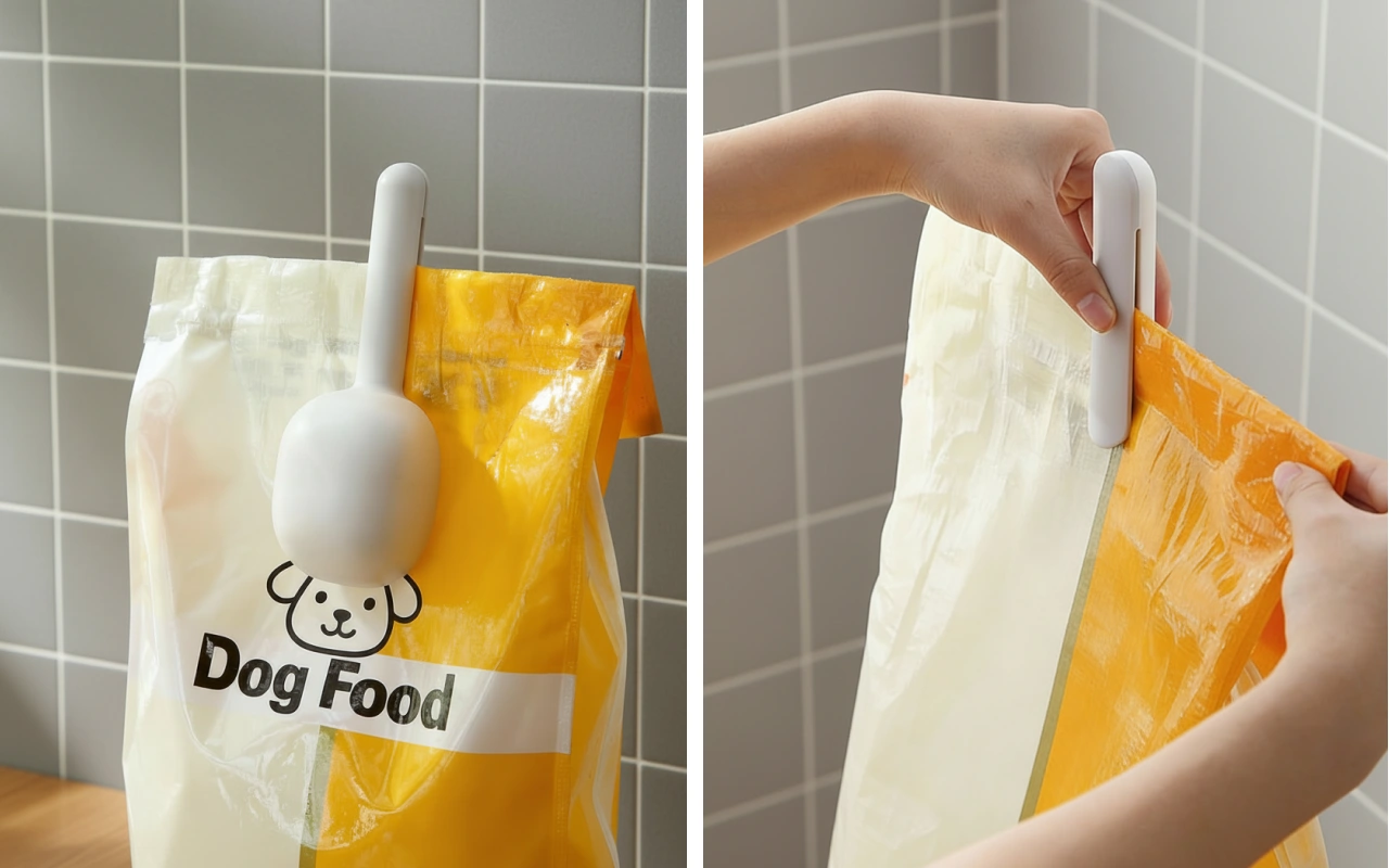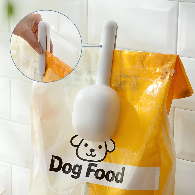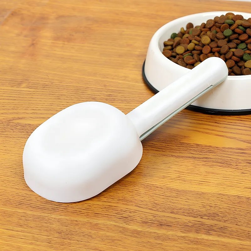Adoro usar esta colher todos os dias porque mantém minhas mãos limpas e a ração nunca derrama. O clip realmente ajuda a comida a ficar fresca por mais tempo.