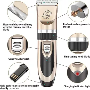 A lâmina possui 5 posições de corte e, com os 4 pentes de encaixe (3mm/6mm/9mm/12mm), obtém 25 comprimentos de corte diferentes no total. É ideal para corte e aparo de corpo inteiro em todas as raças. Este kit inclui uma máquina de cortar, uma lâmina removível, uma bateria recarregável, um bloco de carregamento, uma escova de limpeza e óleo lubrificante. A ferramenta de higiene também pode ser usada durante o carregamento, para que não precise se preocupar que ela pare de funcionar e o seu cão fique meio aparado.