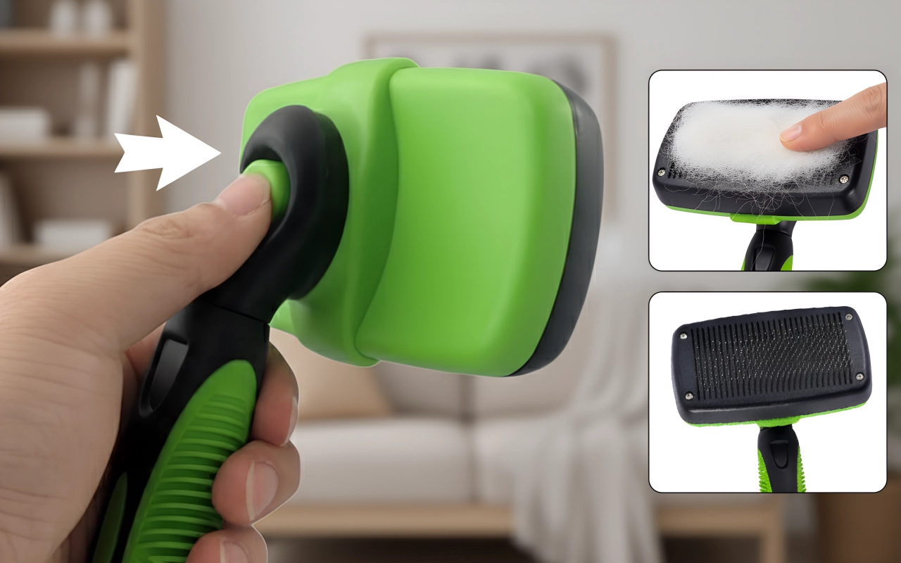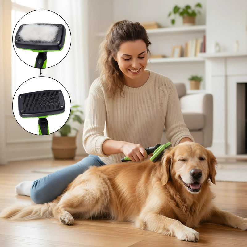 Meu poodle odeia a maioria das escovas, mas essa é bem suave. A limpeza com um toque é ótima—fácil de usar e não puxa o pelo dela.