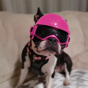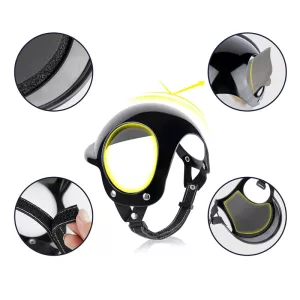 Nosso capacete e óculos para cães são projetados com fitas de fixação para o queixo e a cabeça. Eles vão se ajustar perfeitamente ao seu cão e permanecer no lugar durante os passeios.