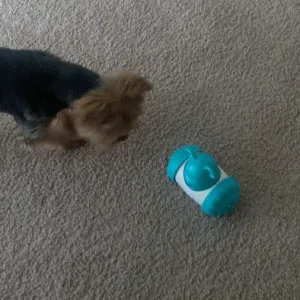 A minha cadela adora. Ela empurra-o tentando derrubar os petiscos. Serve para a comida do seu cão pequeno.