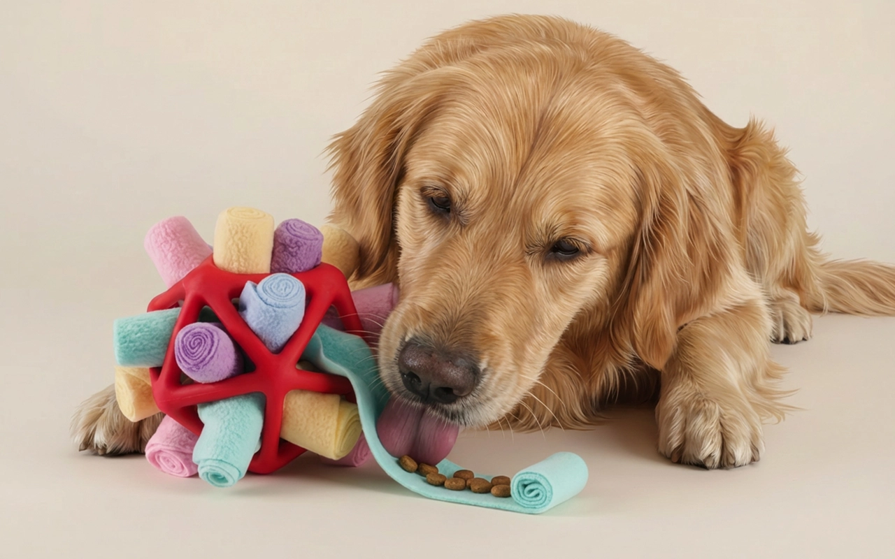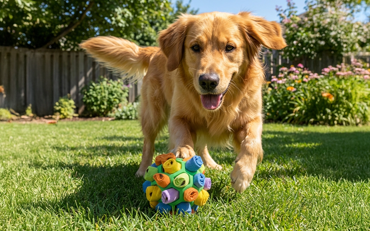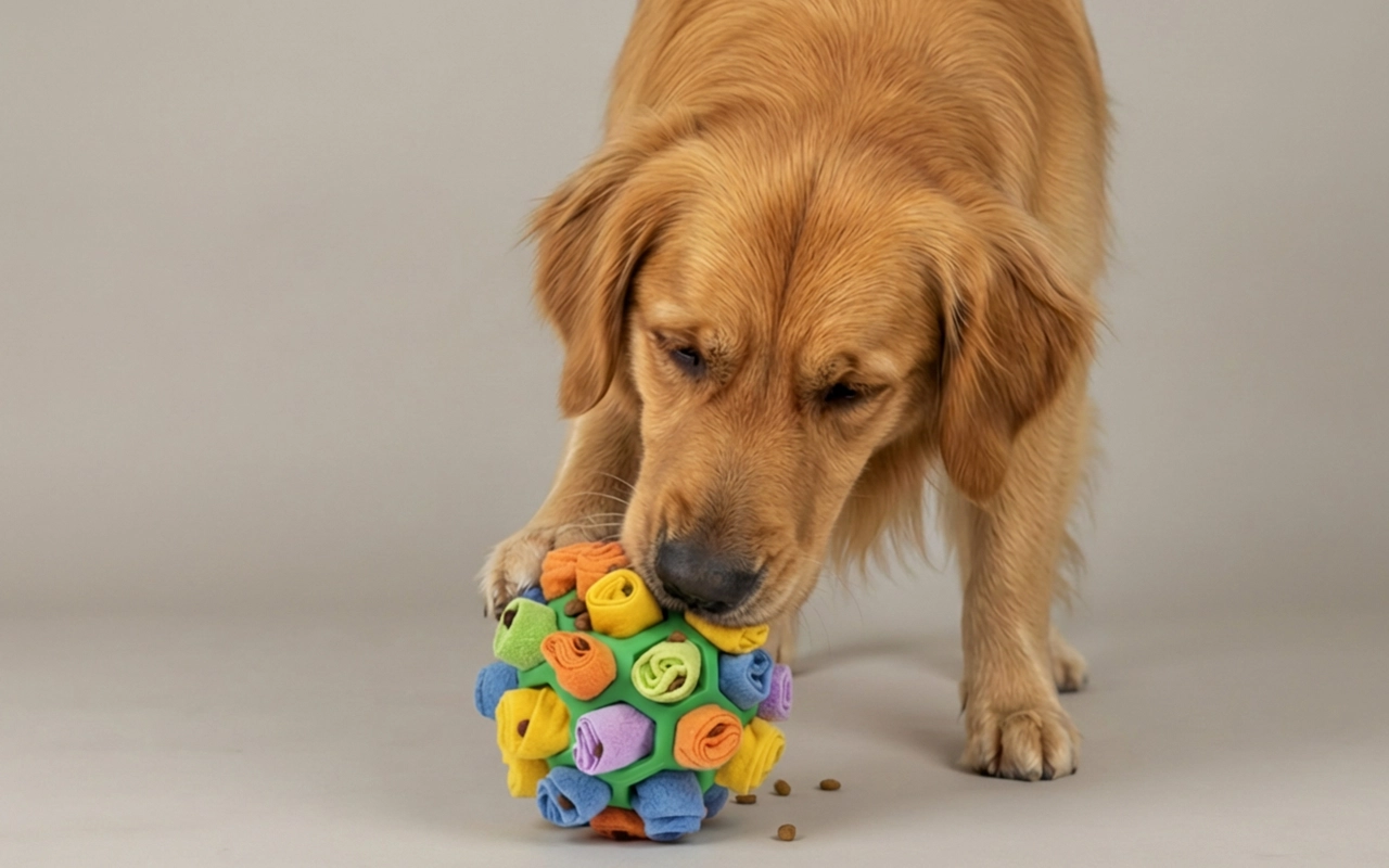 Comprei este brinquedo snuffle para meu cachorro. As cores são vivas e divertidas, e ele realmente come mais devagar agora. Ótimo também para dias chuvosos dentro de casa!