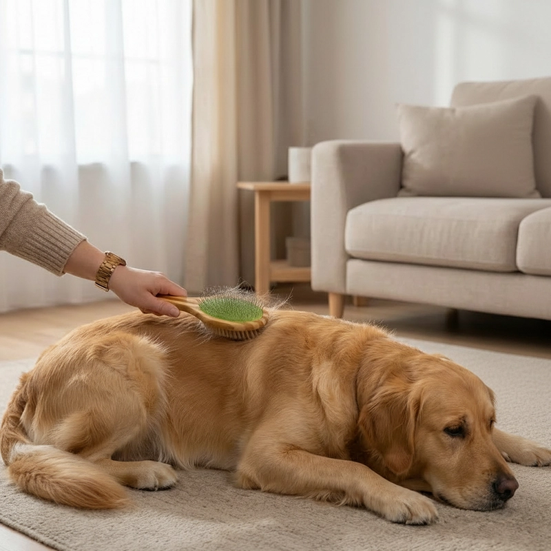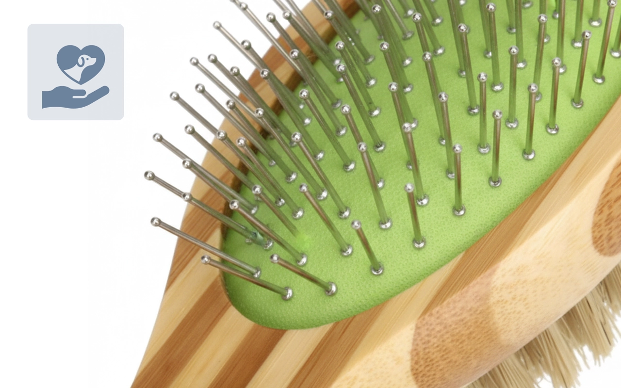 Esta escova torna o cuidado diário tão fácil. Meu cachorro senta pacientemente e até abana o rabo enquanto uso. O lado das cerdas deixa o pelo dele super brilhante.