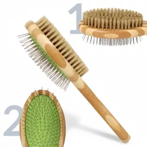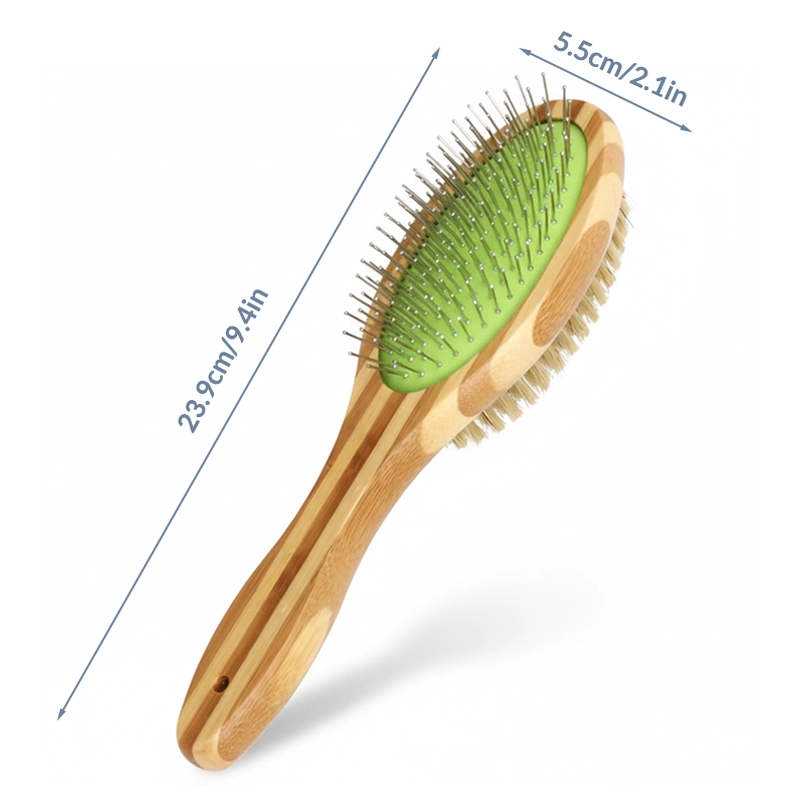 Alterne facilmente entre o lado de cerdas e o lado de pinos para um cuidado completo. Cada lado combate nós ou alisa a pelagem para um acabamento impecável.