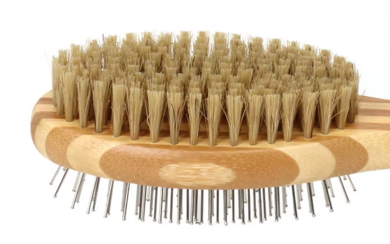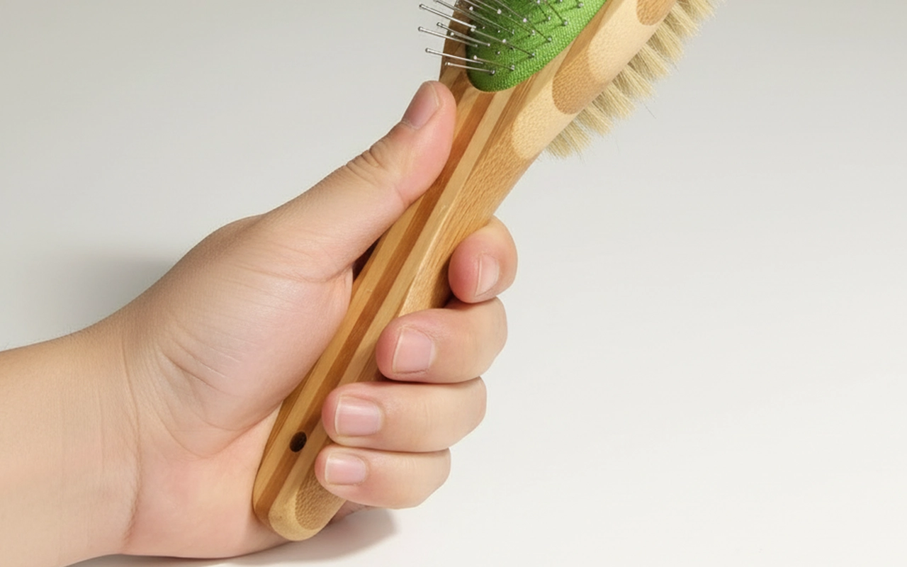 Segure a escova com segurança, mesmo durante longas sessões de cuidado. O cabo de bambu é natural ao toque e permanece firme na sua mão.