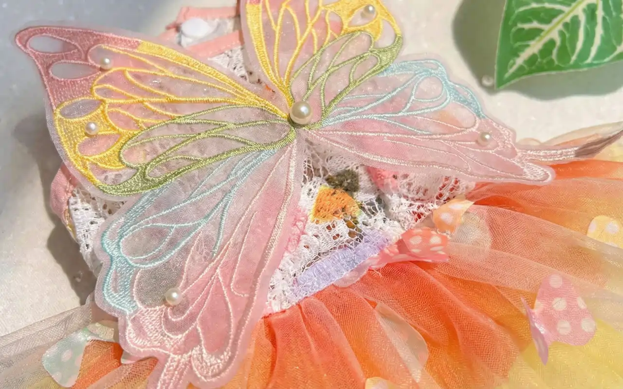 Transforme seu pet instantaneamente em uma visão de conto de fadas. Belos detalhes de renda e asas de borboleta adicionam um toque de fantasia irresistível.