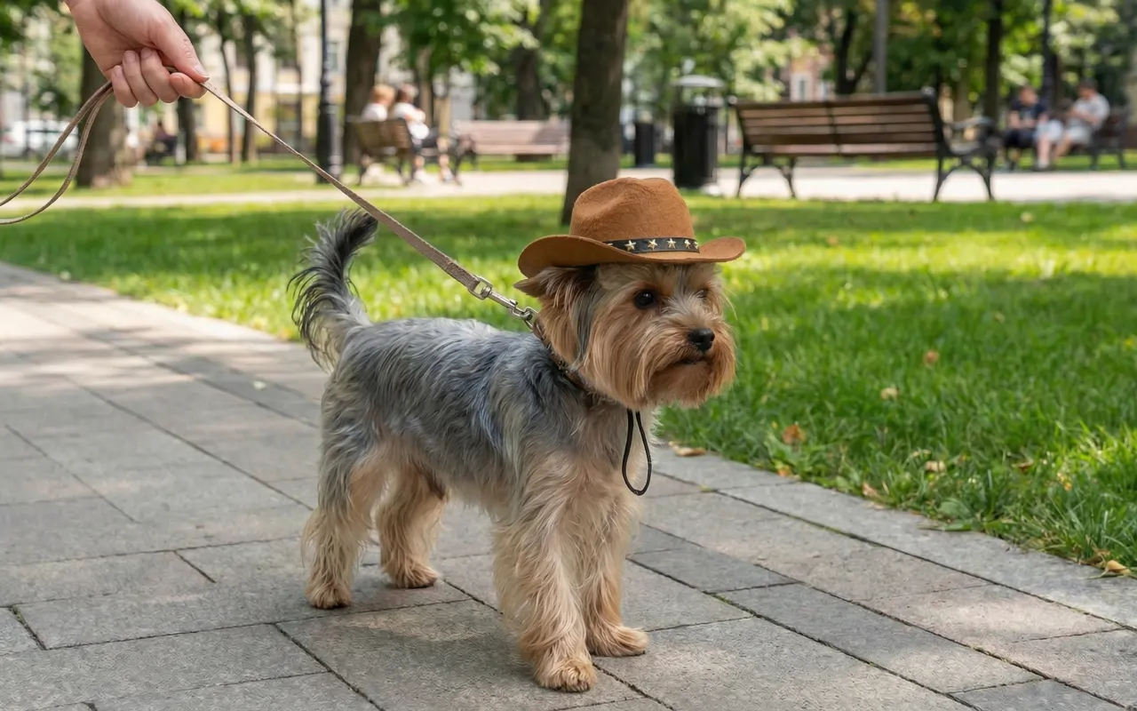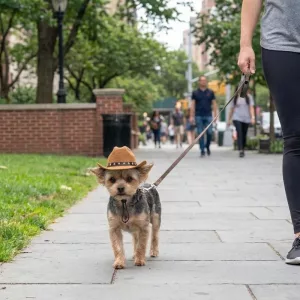 Comprei este pequeno chapéu de caubói para o meu cachorro, e agora todo passeio noturno vira um pequeno desfile. Ele desfila todo exibido e as pessoas não param de rir.