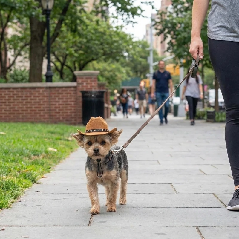Nosso cachorro parece um mini caubói; os vizinhos sorriem em todo passeio.