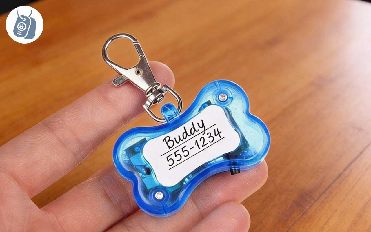 Escreva informações importantes de segurança no espaço dedicado. Identificação rápida significa que pets perdidos voltam para casa mais rápido.