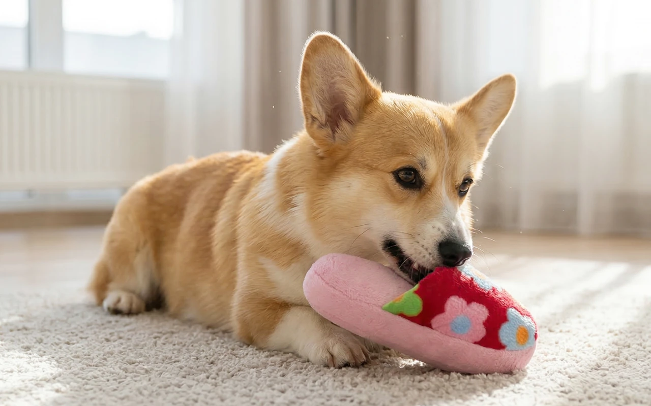 Os cães se concentram em mastigar o chinelo de pelúcia Primdog, poupando sapatos e móveis. Saídas saudáveis para a energia reduzem hábitos destrutivos dentro de casa.