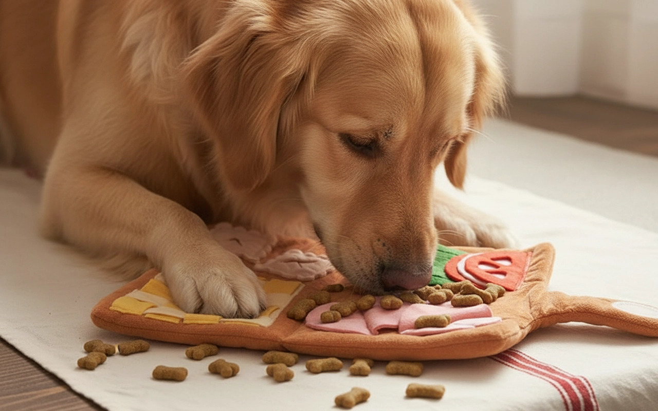 Minha labradora fica tão animada toda manhã quando pego o tapete de farejar. Ela passa muito tempo cheirando a ração e balançando o rabo sem parar.