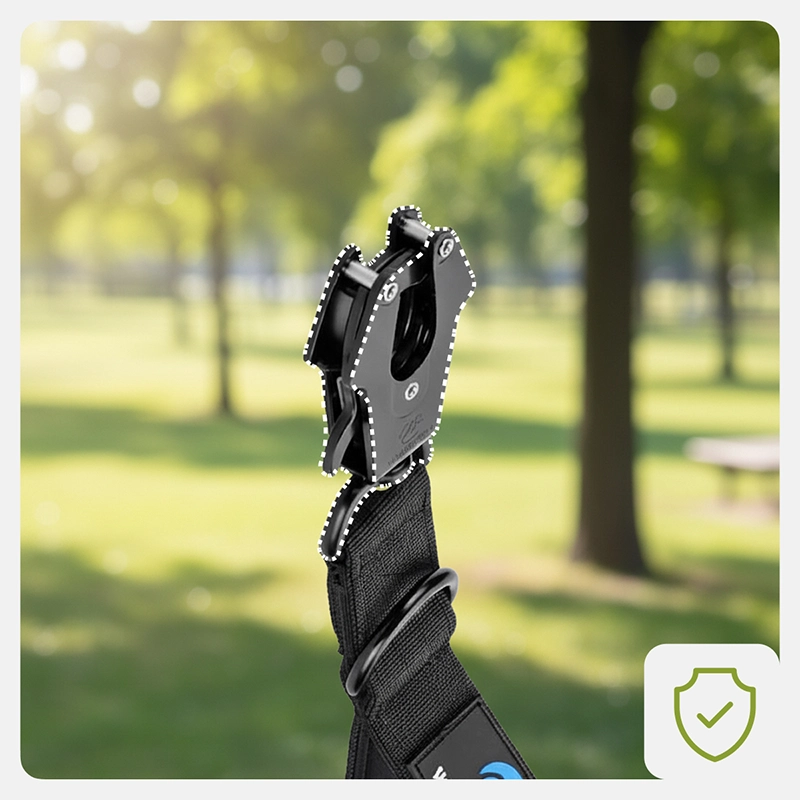 Clipe rápido conecta ou desconecta em apenas segundos. Sem dificuldades em momentos urgentes ou ao entrar em veículos.