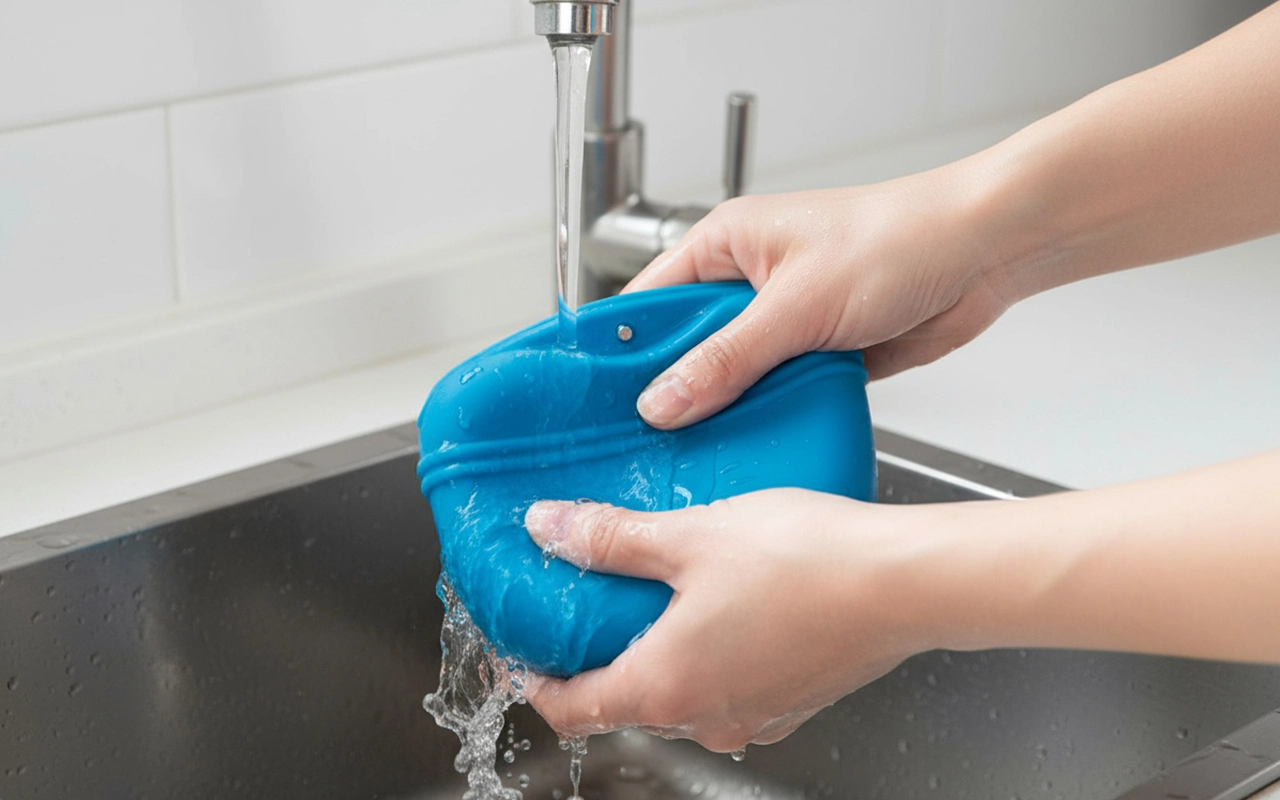 A lavagem leva segundos, mantendo o porta-petiscos sempre fresco e higiênico. O silicone vira do avesso para enxágue completo após cada uso.