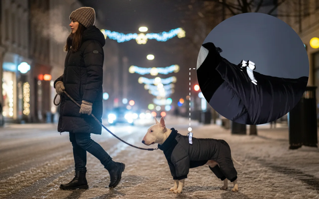 Meu cachorro adora usar seu novo casaco de inverno. Ele o mantém aquecido, e as linhas brilhantes me deixam mais tranquila em passear com ele à noite.